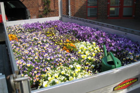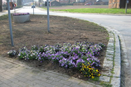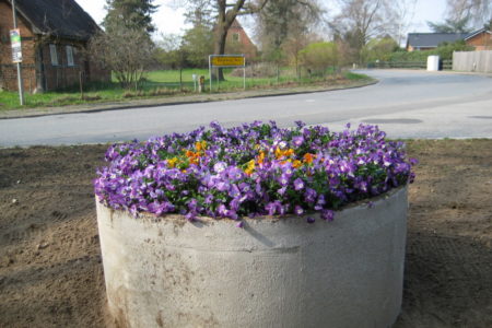 Am heutigen Sonnabend trafen sich neun Freiwillige im strahlenden Sonnenschein, um unser Dorf zu verschönern: Nämlich mit Stiefmütterchen, die von der Gärtnerei Jordt gespendet worden waren. Es war ein ganzer Anhänger voll!